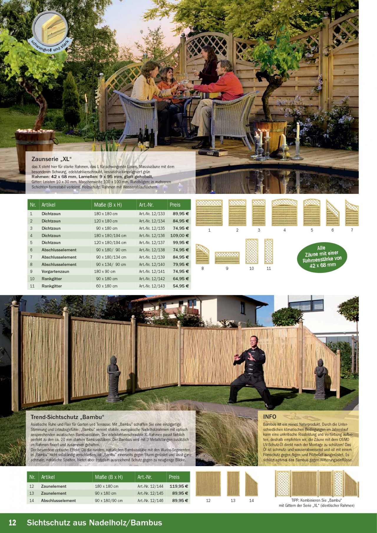 INHALT: hw u ng vo ll und sta Zaunserie ,,XL" das X steht hier für starke Rahmen, das L für schwingende Linien, Massivzäune mit dem besonderen Schwung, edelstahlverschraubt, kesseldruckimprägniert grün Rahmen: 42 x 68 mm, Lamellen: 9 x 95 mm, glatt gehobelt, Gitter: Leisten 10 x 30 mm, Maschenweite 100 x 100 mm, Rundbögen: in mehreren Schichten formstabil verleimt, Holzschutz: Rahmen mit Wasserablauflöchern Nr. 1 2 3 4 5 6 7 8 9 10 11 Artikel Dichtzaun Dichtzaun Dichtzaun Dichtzaun Dichtzaun Abschlusselement Abschlusselement Abschlusselement Vorgartenzaun Rankgitter Rankgitter rk Nr. 12 13 14 12 Sichtschutz aus Nadelholz/Bambus sc Maße (B x H) 180 x 180 cm 120 x 180 cm 90 x 180 cm 180 x 180/194 cm 120 x 180/194 cm 90 x 180/ 90 cm 90 x 180/134 cm 90 x 134/ 90 cm 180 x 90 cm 90 x 180 cm 60 x 180 cm Art.-Nr. Art.-Nr. 12/133 Art.-Nr. 12/134 Art.-Nr. 12/135 Art.-Nr. 12/136 Art.-Nr. 12/137 Art.-Nr. 12/138 Art.-Nr. 12/139 Art.-Nr. 12/140 Art.-Nr. 12/141 Art.-Nr. 12/142 Art.-Nr. 12/143 Preis 89,95 84,95 74,95 109,00 99,95 74,95 84,95 79,95 74,95 64,95 54,95 8 9 10 11 1 2 3 4 5 6 7 Alle Zäune mit einer n Rahmenstärke vo 42 x 68 mm Trend-Sichtschutz ,,Bambu" Asiatische Ruhe und Flair für Garten und Terrasse: Mit ,,Bambu" schaffen Sie eine einzigartige Stimmung und Urlaubsgefühle. ,,Bambu" vereint stabile, europäische Nadelholzrahmen mit optisch ansprechenden asiatischen Bambusstäben. Der edelstahlverschraubte XL-Rahmen passt farblich perfekt zu den ca. 20 mm starken Bambusstäben. Der Bambus wird mit 3 Metallstangen zusätzlich im Rahmen fixiert und zusammen gehalten. Der besondere optische Effekt: Da die runden, natürlichen Bambusstäbe mit den Wuchs-Segmenten in ,,Bambu" nicht vollständig verschließen, ist ,,Bambu" einerseits gegen Sturm gerüstet und lässt ganz schmale, natürliche Spalten, bietet aber trotzdem ausreichend Schutz gegen zu neugierige Blicke. INFO Bambus ist ein reines Naturprodukt. Durch die Unterschiedlichen klimatischen Bedingungen im Jahreslauf kann eine unkritische Rissbildung und Verfärbung auftreten, deshalb empfehlen wir, die Zäune mit dem OSMO UV-Schutz-Öl direkt nach der Montage zu schützen! Das Öl ist schmutz- und wasserabweisend und ist mit einem Filmschutz gegen Algen- und Pilzbefall ausgerüstet. Es schützt optimal den Bambus gegen Witterungseinflüsse. Artikel Zaunelement Zaunelement Abschlusselement Maße (B x H) 180 x 180 cm 90 x 180 cm 90 x 180/90 cm Art.-Nr. Art.-Nr. 12/144 Art.-Nr. 12/145 Art.-Nr. 12/146 Preis 119,95 89,95 89,95 12 13 14 TIPP: Kombinieren Sie ,,Bambu" mit Gittern der Serie ,,XL" (identischer Rahmen)