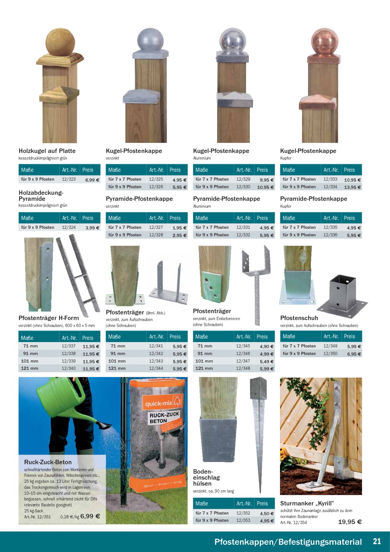 INHALT: Holzkugel auf Platte kesseldruckimprägniert grün Kugel-Pfostenkappe verzinkt Kugel-Pfostenkappe Aluminium Kugel-Pfostenkappe Kupfer Maße für 9 x 9 Pfosten Art.-Nr. Preis 12/323 6,99 Maße für 7 x 7 Pfosten für 9 x 9 Pfosten Art.-Nr. Preis 12/325 12/326 4,95 5,95 Maße für 7 x 7 Pfosten für 9 x 9 Pfosten Art.-Nr. Preis 12/329 12/330 9,95 10,95 Maße für 7 x 7 Pfosten für 9 x 9 Pfosten Art.-Nr. Preis 12/333 12/334 10,95 13,95 HolzabdeckungPyramide kesseldruckimprägniert grün Pyramide-Pfostenkappe verzinkt Pyramide-Pfostenkappe Aluminium Pyramide-Pfostenkappe Kupfer Maße für 9 x 9 Pfosten Art.-Nr. Preis 12/324 3,99 Maße für 7 x 7 Pfosten für 9 x 9 Pfosten Art.-Nr. Preis 12/327 12/328 1,95 2,95 Maße für 7 x 7 Pfosten für 9 x 9 Pfosten Art.-Nr. Preis 12/331 12/332 4,95 5,95 Maße für 7 x 7 Pfosten für 9 x 9 Pfosten Art.-Nr. Preis 12/335 12/336 4,95 5,95 Pfostenträger H-Form verzinkt (ohne Schrauben), 600 x 60 x 5 mm Pfostenträger (ähnl. Abb.) verzinkt, zum Aufschrauben (ohne Schrauben) Maße 71 mm 91 mm 101 mm 121 mm Pfostenträger verzinkt, zum Einbetonieren (ohne Schrauben) Pfostenschuh verzinkt, zum Aufschrauben (ohne Schrauben) Maße 71 mm 91 mm 101 mm 121 mm Art.-Nr. Preis 12/337 12/338 12/339 12/340 11,95 11,95 11,95 11,95 Art.-Nr. Preis 12/341 12/342 12/343 12/344 5,95 5,95 5,95 5,95 Maße 71 mm 91 mm 101 mm 121 mm Art.-Nr. Preis 12/345 12/346 12/347 12/348 4,90 4,99 5,49 5,99 Maße für 7 x 7 Pfosten für 9 x 9 Pfosten Art.-Nr. Preis 12/349 12/350 5,95 6,95 Ruck-Zuck-Beton schnellhärtender Beton zum Montieren und Fixieren von Zaunpfählen, Wäschespinnen etc., 25 kg ergeben ca. 13 Liter Fertigmischung, das Trockengemisch wird in Lagen von 1015 cm eingebracht und mit Wasser begossen, schnell erhärtend (nicht für DINrelevante Bauteile geeignet) 25 kg-Sack Art.-Nr. 12/351 0,28 /kg 6,99 Bodeneinschlag hülsen verzinkt, ca. 90 cm lang Maße für 7 x 7 Pfosten für 9 x 9 Pfosten Art.-Nr. Preis 12/352 12/353 4,50 4,95 Sturmanker ,,Kyrill" schützt Ihre Zaunanlage zusätzlich zu dem normalen Bodenanker Art.-Nr. 12/354 19,95 Pfostenkappen/Befestigungsmaterial 21