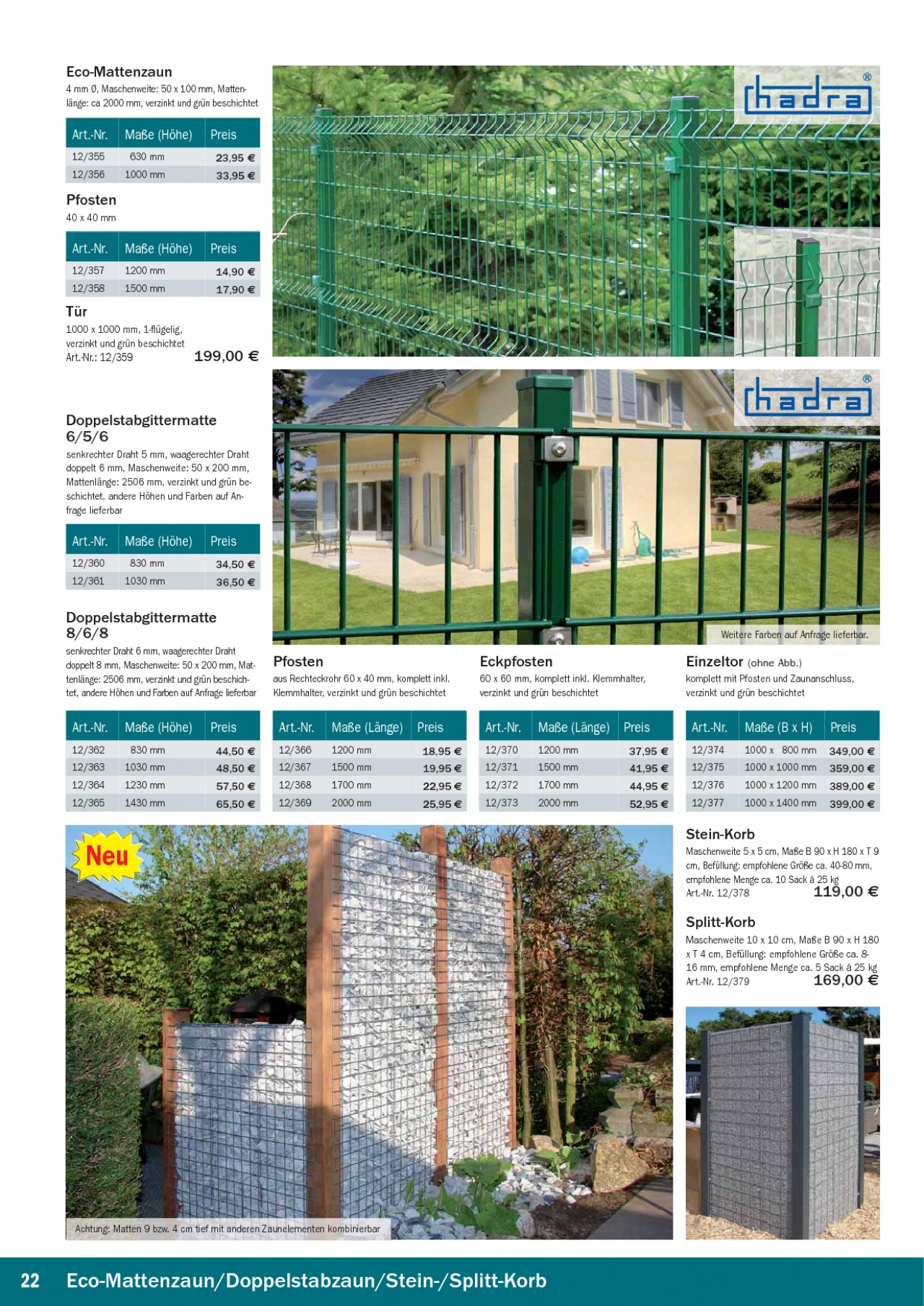 INHALT: Eco-Mattenzaun 4 mm Ø, Maschenweite: 50 x 100 mm, Mattenlänge: ca 2000 mm, verzinkt und grün beschichtet R Art.-Nr. 12/355 12/356 Maße (Höhe) 630 mm 1000 mm Preis 23,95 33,95 Pfosten 40 x 40 mm Art.-Nr. 12/357 12/358 Maße (Höhe) 1200 mm 1500 mm Preis 14,90 17,90 Tür 1000 x 1000 mm, 1-flügelig, verzinkt und grün beschichtet Art.-Nr.: 12/359 199,00 R Doppelstabgittermatte 6/5/6 senkrechter Draht 5 mm, waagerechter Draht doppelt 6 mm, Maschenweite: 50 x 200 mm, Mattenlänge: 2506 mm, verzinkt und grün beschichtet, andere Höhen und Farben auf Anfrage lieferbar Art.-Nr. 12/360 12/361 Maße (Höhe) 830 mm 1030 mm Preis 34,50 36,50 Doppelstabgittermatte 8/6/8 senkrechter Draht 6 mm, waagerechter Draht doppelt 8 mm, Maschenweite: 50 x 200 mm, Mattenlänge: 2506 mm, verzinkt und grün beschichtet, andere Höhen und Farben auf Anfrage lieferbar Weitere Farben auf Anfrage lieferbar. Pfosten aus Rechteckrohr 60 x 40 mm, komplett inkl. Klemmhalter, verzinkt und grün beschichtet Eckpfosten 60 x 60 mm, komplett inkl. Klemmhalter, verzinkt und grün beschichtet Einzeltor (ohne Abb.) komplett mit Pfosten und Zaunanschluss, verzinkt und grün beschichtet Art.-Nr. 12/374 12/375 12/376 12/377 Art.-Nr. 12/362 12/363 12/364 12/365 Maße (Höhe) 830 mm 1030 mm 1230 mm 1430 mm Preis 44,50 48,50 57,50 65,50 Art.-Nr. 12/366 12/367 12/368 12/369 Maße (Länge) 1200 mm 1500 mm 1700 mm 2000 mm Preis 18,95 19,95 22,95 25,95 Art.-Nr. 12/370 12/371 12/372 12/373 Maße (Länge) 1200 mm 1500 mm 1700 mm 2000 mm Preis 37,95 41,95 44,95 52,95 Maße (B x H) 1000 x 800 mm 1000 x 1000 mm 1000 x 1200 mm 1000 x 1400 mm Preis 349,00 359,00 389,00 399,00 Stein-Korb Neu Maschenweite 5 x 5 cm, Maße B 90 x H 180 x T 9 cm, Befüllung: empfohlene Größe ca. 40-80 mm, empfohlene Menge ca. 10 Sack á 25 kg Art.-Nr. 12/378 119,00 Splitt-Korb Maschenweite 10 x 10 cm, Maße B 90 x H 180 x T 4 cm, Befüllung: empfohlene Größe ca. 816 mm, empfohlene Menge ca. 5 Sack á 25 kg Art.-Nr. 12/379 169,00 Achtung: Matten 9 bzw. 4 cm tief mit anderen Zaunelementen kombinierbar 22 Eco-Mattenzaun/Doppelstabzaun/Stein-/Splitt-Korb