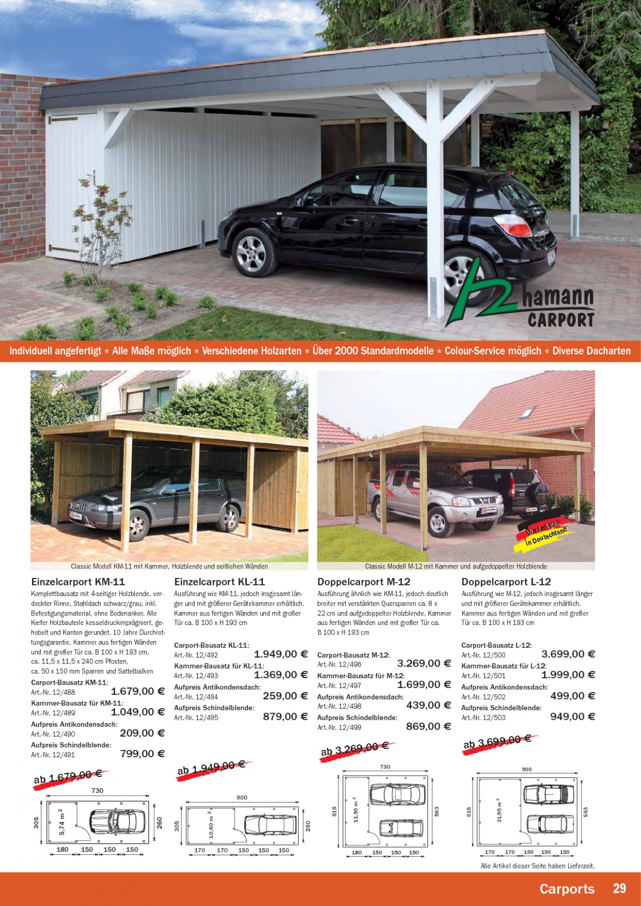 INHALT: Seite wird neu gestaltet Individuell angefertigt * Alle Maße möglich * Verschiedene Holzarten * Über 2000 Standardmodelle * Colour-Service möglich * Diverse Dacharten gen fer ti Wir schland ut e in D Classic Modell KM-11 mit Kammer, Holzblende und seitlichen Wänden Classic Modell M-12 mit Kammer und aufgedoppelter Holzblende Einzelcarport KM-11 Komplettbausatz mit 4-seitiger Holzblende, verdeckter Rinne, Stahldach schwarz/grau, inkl. Befestigungsmaterial, ohne Bodenanker. Alle Kiefer Holzbauteile kesseldruckimprägniert, gehobelt und Kanten gerundet. 10 Jahre Durchrottungsgarantie. Kammer aus fertigen Wänden und mit großer Tür ca. B 100 x H 193 cm, ca. 11,5 x 11,5 x 240 cm Pfosten, ca. 50 x 150 mm Sparren und Sattelbalken Carport-Bausatz KM-11: Art.-Nr. 12/488 1.679,00 Kammer-Bausatz für KM-11: Art.-Nr. 12/489 1.049,00 Aufpreis Antikondensdach: Art.-Nr. 12/490 209,00 Aufpreis Schindelblende: Art.-Nr. 12/491 799,00 Einzelcarport KL-11 Ausführung wie KM-11, jedoch insgesamt länger und mit größerer Gerätekammer erhältlich. Kammer aus fertigen Wänden und mit großer Tür ca. B 100 x H 193 cm Carport-Bausatz KL-11: Art.-Nr. 12/492 1.949,00 Kammer-Bausatz für KL-11: Art.-Nr. 12/493 1.369,00 Aufpreis Antikondensdach: Art.-Nr. 12/494 259,00 Aufpreis Schindelblende: Art.-Nr. 12/495 879,00 Doppelcarport M-12 Ausführung ähnlich wie KM-11, jedoch deutlich breiter mit verstärkten Quersparren ca. 8 x 22 cm und aufgedoppelter Holzblende. Kammer aus fertigen Wänden und mit großer Tür ca. B 100 x H 193 cm Carport-Bausatz M-12: Art.-Nr. 12/496 3.269,00 Kammer-Bausatz für M-12: Art.-Nr. 12/497 1.699,00 Aufpreis Antikondensdach: Art.-Nr. 12/498 439,00 Aufpreis Schindelblende: Art.-Nr. 12/499 869,00 Doppelcarport L-12 Ausführung wie M-12, jedoch insgesamt länger und mit größerer Gerätekammer erhältlich. Kammer aus fertigen Wänden und mit großer Tür ca. B 100 x H 193 cm Carport-Bausatz L-12: Art.-Nr. 12/500 3.699,00 Kammer-Bausatz für L-12: Art.-Nr. 12/501 1.999,00 Aufpreis Antikondensdach: Art.-Nr. 12/502 499,00 Aufpreis Schindelblende: Art.-Nr. 12/503 949,00 0 ab 3.269,0 0 ab 1.949,0 11,90 m 2 730 0 ab 3.699,0 900 0 ab 1.679,0 730 5,74 m 2 21,95 m 2 900 616 563 616 10,60 m 2 305 260 305 180 150 150 150 170 170 150 150 150 260 180 150 150 150 170 170 150 150 150 Alle Artikel dieser Seite haben Lieferzeit. 563 Carports Kunststoffzäune 29