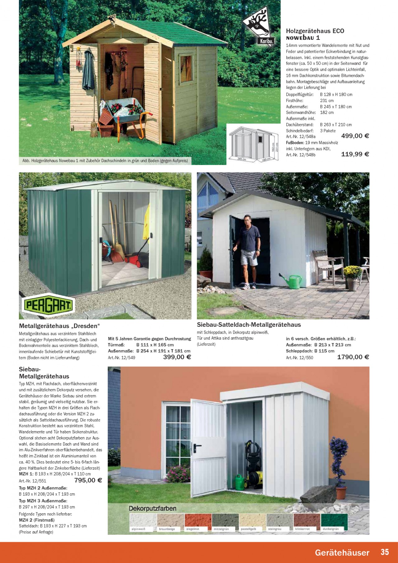 INHALT: Holzgerätehaus ECO nowebau 1 14mm vormontierte Wandelemente mit Nut und Feder und patentierter Eckverbindung in naturbelassen. Inkl. einem feststehenden Kunstglasfenster (ca. 50 x 50 cm) in der Seitenwand für eine bessere Optik und optimalen Lichteinfall, 16 mm Dachkonstruktion sowie Bitumendachbahn. Montagebeschläge und Aufbauanleitung liegen der Lieferung bei Doppelflügeltür: B 128 x H 180 cm Firsthöhe: 231 cm Außenmaße: B 245 x T 180 cm Seitenwandhöhe: 182 cm Außenmaße inkl. Dachüberstand: B 263 x T 210 cm Schindelbedarf: 3 Pakete Art.-Nr. 12/548a 499,00 Fußboden: 19 mm Massivholz inkl. Unterlegern aus KDI, Art.-Nr. 12/548b 119,99 Abb. Holzgerätehaus Nowebau 1 mit Zubehör Dachschindeln in grün und Boden (gegen Aufpreis) Metallgerätehaus ,,Dresden" Metallgerätehaus aus verzinktem Stahlblech mit einlagiger Polyesterlackierung, Dach- und Bodenrahmenteile aus verzinktem Stahlblech, innenlaufende Schiebetür mit Kunststoffgleitern (Boden nicht im Lieferumfang) Mit 5 Jahren Garantie gegen Durchrostung Türmaß: B 111 x H 165 cm Außenmaße: B 254 x H 191 x T 181 cm Art.-Nr. 12/549 399,00 Siebau-Satteldach-Metallgerätehaus mit Schleppdach, in Dekorputz alpinweiß, Tür und Attika sind anthrazitgrau (Lieferzeit) in 6 versch. Größen erhältlich, z.B.: Außenmaße: B 213 x T 213 cm Schleppdach: B 115 cm Art.-Nr. 12/550 1790,00 SiebauMetallgerätehaus Typ MZH, mit Flachdach, oberflächenverzinkt und mit zusätzlichem Dekorputz versehen, die Gerätehäuser der Marke Siebau sind extrem stabil, geräumig und vielseitig nutzbar. Sie erhalten die Typen MZH in drei Größen als Flachdachausführung oder die Version MZH 2 zusätzlich als Satteldachausführung. Die robuste Konstruktion besteht aus verzinktem Stahl, Wandelemente und Tür haben Sickenstruktur. Optional stehen acht Dekorputzfarben zur Auswahl, die Basiselemente Dach und Wand sind im Alu-Zinkverfahren oberflächenbehandelt, das heißt im Zinkbad ist ein Aluminiumanteil von ca. 40 %. Dies bedeutet eine 5- bis 6-fach längere Haltbarkeit der Zinkober fläche (Lieferzeit) MZH 1: B 193 x H 208/204 x T 110 cm Art.-Nr. 12/551 795,00 Typ MZH 2 Außenmaße: B 193 x H 208/204 x T 193 cm Typ MZH 3 Außenmaße: B 297 x H 208/204 x T 193 cm Folgende Typen noch lieferbar: MZH 2 (Firstmaß) Satteldach: B 193 x H 227 x T 193 cm (Preise auf Anfrage) Dekorputzfarben Gerätehäuser Carports 35