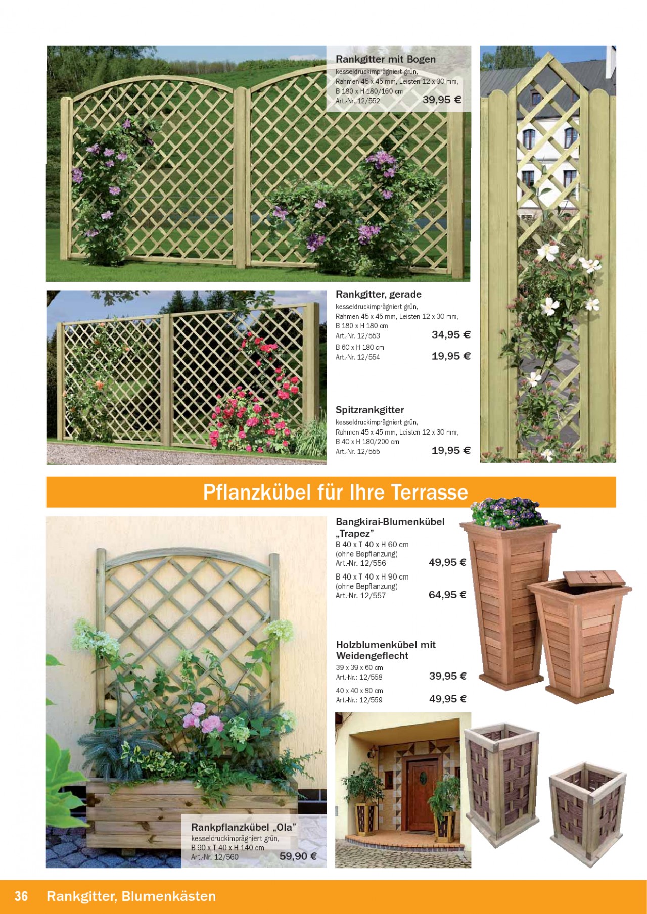 INHALT: Rankgitter mit Bogen kesseldruckimprägniert grün, Rahmen 45 x 45 mm, Leisten 12 x 30 mm, B 180 x H 180/160 cm Art.-Nr. 12/552 39,95 Rankgitter, gerade kesseldruckimprägniert grün, Rahmen 45 x 45 mm, Leisten 12 x 30 mm, B 180 x H 180 cm Art.-Nr. 12/553 34,95 B 60 x H 180 cm Art.-Nr. 12/554 19,95 Spitzrankgitter kesseldruckimprägniert grün, Rahmen 45 x 45 mm, Leisten 12 x 30 mm, B 40 x H 180/200 cm Art.-Nr. 12/555 19,95 Pflanzkübel für Ihre Terrasse Bangkirai-Blumenkübel ,,Trapez" B 40 x T 40 x H 60 cm (ohne Bepflanzung) Art.-Nr. 12/556 B 40 x T 40 x H 90 cm 49,95 64,95 (ohne Bepflanzung) Art.-Nr. 12/557 Holzblumenkübel mit Weidengeflecht 39 x 39 x 60 cm Art.-Nr.: 12/558 40 x 40 x 80 cm Art.-Nr.: 12/559 39,95 49,95 Rankpflanzkübel ,,Ola" kesseldruckimprägniert grün, B 90 x T 40 x H 140 cm Art.-Nr. 12/560 59,90 36 Rankgitter, Blumenkästen