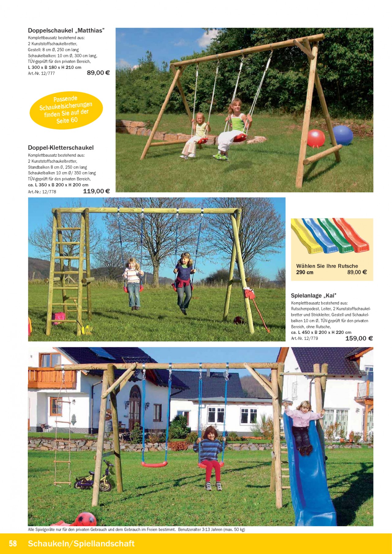 INHALT: Doppelschaukel ,,Matthias" Komplettbausatz bestehend aus: 2 Kunststoffschaukelbretter, Gestell: 8 cm Ø, 250 cm lang Schaukelbalken: 10 cm Ø, 300 cm lang, TÜV-geprüft für den privaten Bereich, L 300 x B 180 x H 210 cm Art.-Nr. 12/777 89,00 Passende gen Schaukelsicherun r e auf de finden Si Seite 60 Doppel-Kletterschaukel Komplettbausatz bestehend aus: 2 Kunststoffschaukelbretter, Standbalken 8 cm Ø, 250 cm lang Schaukelbalken 10 cm Ø/ 350 cm lang TÜV-geprüft für den privaten Bereich, ca. L 350 x B 200 x H 200 cm Art.-Nr.: 12/778 119,00 Wählen Sie Ihre Rutsche 290 cm 89,00 Spielanlage ,,Kai" Komplettbausatz bestehend aus: Rutschenpodest, Leiter, 2 Kunststoffschaukelbretter und Strickleiter, Gestell und Schaukelbalken 10 cm Ø, TÜV-geprüft für den privaten Bereich, ohne Rutsche, ca. L 450 x B 200 x H 220 cm Art.-Nr. 12/779 159,00 Alle Spielgeräte nur für den privaten Gebrauch und dem Gebrauch im Freien bestimmt. Benutzeralter 3-13 Jahren (max. 50 kg) 58 Schaukeln/Spiellandschaft