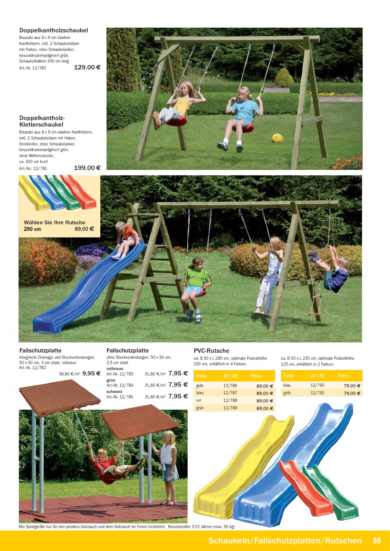 INHALT: Doppelkantholzschaukel Bausatz aus 9 x 9 cm starken Kanthölzern, inkl. 2 Schaukelsitzen mit Haken, ohne Schaukelanker, kesseldruckimprägniert grün, Schaukelbalken 300 cm lang Art.-Nr. 12/780 129,00 DoppelkantholzKletterschaukel Bausatz aus 9 x 9 cm starken Kanthölzern, inkl. 2 Schaukelsitzen mit Haken, Strickleiter, ohne Schaukelanker, kesseldruckimprägniert grün, ohne Wellenrutsche, ca. 430 cm breit Art.-Nr.: 12/781 199,00 Wählen Sie Ihre Rutsche 290 cm 89,00 Fallschutzplatte integrierte Drainage und Steckverbindungen, 50 x 50 cm, 3 cm stark, rotbraun Art.-Nr. 12/782 39,80 /m2 9,95 Fallschutzplatte ohne Steckverbindungen, 50 x 50 cm, 2,5 cm stark rotbraun Art.-Nr. 12/783 31,80 /m2 7,95 grün Art.-Nr. 12/784 31,80 /m2 7,95 schwarz Art.-Nr. 12/785 31,80 /m2 7,95 PVC-Rutsche ca. B 50 x L 290 cm, optimale Podesthöhe 150 cm, erhältlich in 4 Farben: ca. B 50 x L 230 cm, optimale Podesthöhe 125 cm, erhältlich in 2 Farben: Farbe gelb blau rot grün Art.-Nr. 12/786 12/787 12/788 12/789 Preis 89,00 89,00 89,00 89,00 Farbe blau gelb Art.-Nr. 12/790 12/791 Preis 79,00 79,00 Alle Spielgeräte nur für den privaten Gebrauch und dem Gebrauch im Freien bestimmt. Benutzeralter 3-13 Jahren (max. 50 kg) Schaukeln/Fallschutzplatten/Rutschen 59