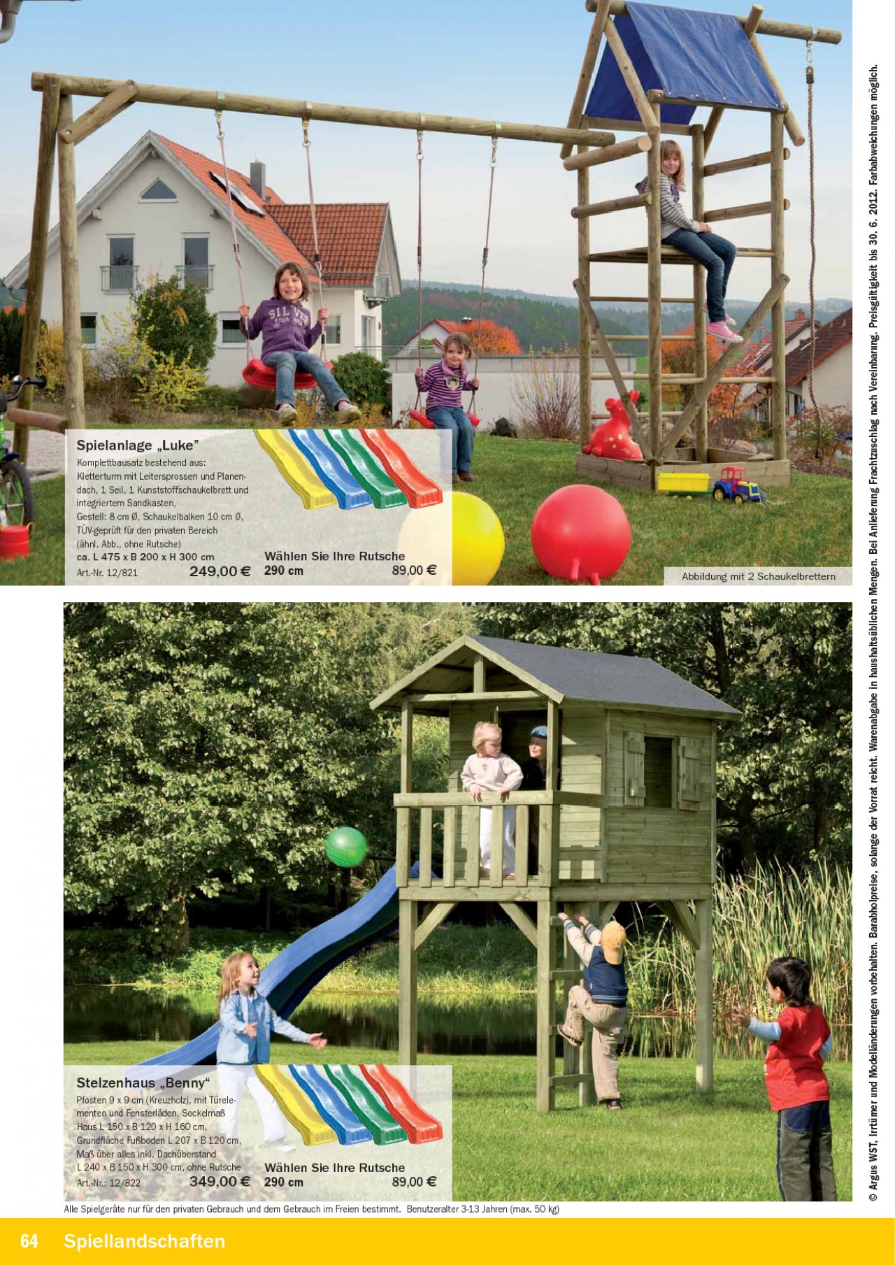INHALT: Spielanlage ,,Luke" Komplettbausatz bestehend aus: Kletterturm mit Leitersprossen und Planendach, 1 Seil, 1 Kunststoffschaukelbrett und integriertem Sandkasten, Gestell: 8 cm Ø, Schaukelbalken 10 cm Ø, TÜV-geprüft für den privaten Bereich (ähnl. Abb., ohne Rutsche) ca. L 475 x B 200 x H 300 cm Art.-Nr. 12/821 249,00 Wählen Sie Ihre Rutsche 290 cm 89,00 Abbildung mit 2 Schaukelbrettern Stelzenhaus ,,Benny" Pfosten 9 x 9 cm (Kreuzholz), mit Türelementen und Fensterläden, Sockelmaß Haus L 150 x B 120 x H 160 cm, Grundfläche Fußboden L 207 x B 120 cm, Maß über alles inkl. Dachüberstand L 240 x B 150 x H 300 cm, ohne Rutsche Art.-Nr.: 12/822 349,00 Wählen Sie Ihre Rutsche 290 cm 89,00 Alle Spielgeräte nur für den privaten Gebrauch und dem Gebrauch im Freien bestimmt. Benutzeralter 3-13 Jahren (max. 50 kg) 64 Spiellandschaften © Argus WST, Irrtümer und Modelländerungen vorbehalten. Barabholpreise, solange der Vorrat reicht. Warenabgabe in haushaltsüblichen Mengen. Bei Anlieferung Frachtzuschlag nach Vereinbarung. Preisgültigkeit bis 30. 6. 2012. Farbabweichungen möglich.