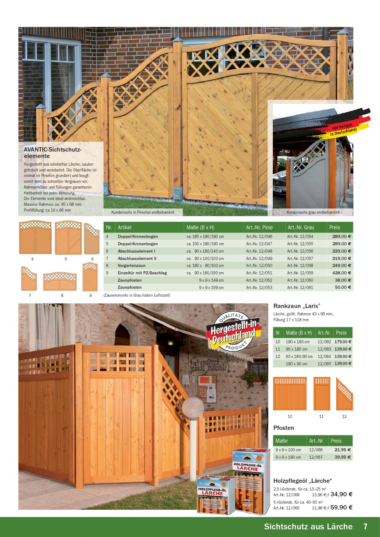 INHALT: igen Wir fert land! h Deutsc in AVANTIC-Sichtschutzelemente Hergestellt aus sibirischer Lärche, sauber gehobelt und verarbeitet. Die Oberfläche ist einmal im Pinieton grundiert und beugt somit dem zu schnellen Vergrauen vor. Rahmenhölzer und Füllungen garantieren Haltbarkeit bei jeder Witterung. Die Elemente sind ideal anstreichbar. Massive Rahmen: ca. 45 x 68 mm Profilfüllung: ca 14 x 96 mm Kundenseits in Pinieton endbehandelt Kundenseits grau endbehandelt Nr. 4 5 6 4 5 6 7 8 9 Artikel Doppel-Kronenbogen Doppel-Kronenbogen Abschlusselement I Abschlusselement II Vorgartenzaun Einzeltür mit PZ-Beschlag Zaunpfosten Zaunpfosten Maße (B x H) ca. 180 x 180/190 cm ca. 150 x 180/190 cm ca. 90 x 180/140 cm ca. 90 x 140/100 cm ca. 180 x 90/100 cm ca. 90 x 180/190 cm 9 x 9 x 149 cm 9 x 9 x 199 cm Art.-Nr. Pinie Art.-Nr. 12/046 Art.-Nr. 12/047 Art.-Nr. 12/048 Art.-Nr. 12/049 Art.-Nr. 12/050 Art.-Nr. 12/051 Art.-Nr. 12/052 Art.-Nr. 12/053 Art.-Nr. Grau Art.-Nr. 12/054 Art.-Nr. 12/055 Art.-Nr. 12/056 Art.-Nr. 12/057 Art.-Nr. 12/058 Art.-Nr. 12/059 Art.-Nr. 12/060 Art.-Nr. 12/061 Preis 289,00 289,00 229,00 219,00 249,00 428,00 38,00 50,00 7 8 9 (Zaunelemente in Grau haben Lieferzeit) Rankzaun ,,Larix" Lärche, geölt, Rahmen 43 x 95 mm, Füllung 17 x 118 mm Nr. Maße (B x H) Art.-Nr. Preis 10 11 12 180 x 180 cm 90 x 180 cm 90 x 180/90 cm 180 x 90 cm 12/062 179,00 12/063 139,00 12/064 139,00 12/065 139,00 10 11 12 Pfosten Maße 9 x 9 x 100 cm 9 x 9 x 190 cm Art.-Nr. 12/066 12/067 Preis 21,95 39,95 Holzpflegeöl ,,Lärche" 2,5 l-Gebinde, für ca. 1525 m2 Art.-Nr. 12/068 13,96 /l 34,90 5 l-Gebinde, für ca. 4050 m2 Art.-Nr. 12/069 11,98 /l 59,90 Sichtschutz aus Lärche 7