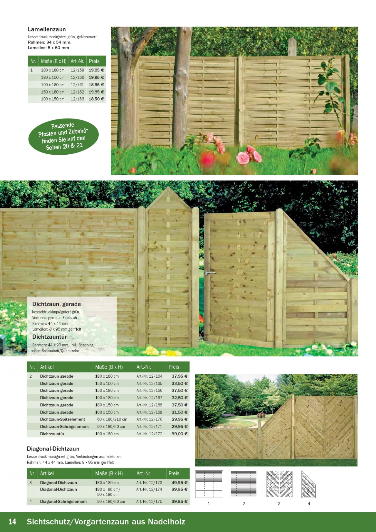 INHALT: Lamellenzaun kesseldruckimprägniert grün, geklammert Rahmen: 34 x 54 mm, Lamellen: 5 x 60 mm Nr. Maße (B x H) Art.-Nr. Preis 1 180 x 180 cm 180 x 150 cm 100 x 180 cm 150 x 180 cm 100 x 150 cm 12/159 12/160 12/161 12/162 12/163 19,95 19,95 18,95 19,95 18,50 Passende r osten und Zubehö Pf auf den finden Sie Seiten 20 & 21 Dichtzaun, gerade kesseldruckimprägniert grün, Verbindungen aus Edelstahl, Rahmen: 44 x 44 mm, Lamellen: 8 x 95 mm geriffelt Dichtzauntür Rahmen: 44 x 90 mm, inkl. Beschlag, ohne Schrauben/Querstrebe Nr. Artikel 2 Dichtzaun gerade Dichtzaun gerade Dichtzaun gerade Dichtzaun gerade Dichtzaun gerade Dichtzaun gerade Dichtzaun-Spitzelement Dichtzaun-Schrägelement Dichtzauntür Maße (B x H) 180 x 180 cm 150 x 150 cm 150 x 180 cm 100 x 180 cm 180 x 150 cm 100 x 150 cm 60 x 180/210 cm 90 x 180/90 cm 100 x 180 cm Art.-Nr. Art.-Nr. 12/164 Art.-Nr. 12/165 Art.-Nr. 12/166 Art.-Nr. 12/167 Art.-Nr. 12/168 Art.-Nr. 12/169 Art.-Nr. 12/170 Art.-Nr. 12/171 Art.-Nr. 12/172 Preis 37,95 33,50 37,50 32,50 37,50 31,50 29,95 29,95 99,00 Diagonal-Dichtzaun kesseldruckimprägniert grün, Verbindungen aus Edelstahl, Rahmen: 44 x 44 mm, Lamellen: 8 x 95 mm geriffelt Nr. Artikel 3 Diagonal-Dichtzaun Diagonal-Dichtzaun Diagonal-Schrägelement Maße (B x H) 180 x 180 cm 180 x 90 cm/ 90 x 180 cm 90 x 180/90 cm Art.-Nr. Art.-Nr. 12/173 Art.-Nr. 12/174 Art.-Nr. 12/175 Preis 49,95 39,95 39,95 1 2 3 4 4 14 Sichtschutz/Vorgartenzaun aus Nadelholz