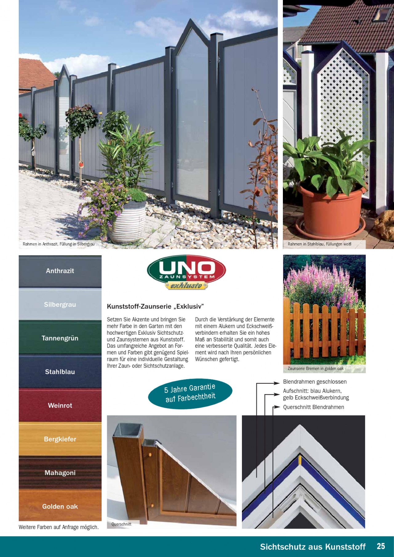 INHALT: Rahmen in Anthrazit, Füllung in Silbergrau Rahmen in Stahlblau, Füllungen weiß Anthrazit Silbergrau Kunststoff-Zaunserie ,,Exklusiv" Setzen Sie Akzente und bringen Sie mehr Farbe in den Garten mit den hochwertigen Exklusiv Sichtschutzund Zaunsystemen aus Kunststoff. Das umfangreiche Angebot an Formen und Farben gibt genügend Spielraum für eine individuelle Gestaltung Ihrer Zaun- oder Sichtschutzanlage. Durch die Verstärkung der Elemente mit einem Alukern und Eckschweißverbindern erhalten Sie ein hohes Maß an Stabilität und somit auch eine verbesserte Qualität. Jedes Element wird nach Ihren persönlichen Wünschen gefertigt. Zaunserie Bremen in golden oak Tannengrün Stahlblau Weinrot 5 Jahre Garantie auf Farbechtheit Blendrahmen geschlossen Aufschnitt: blau Alukern, gelb Eckschweißverbindung Querschnitt Blendrahmen Bergkiefer Mahagoni Golden oak Weitere Farben auf Anfrage möglich. Querschnitt Sichtschutz aus Kunststoff 25