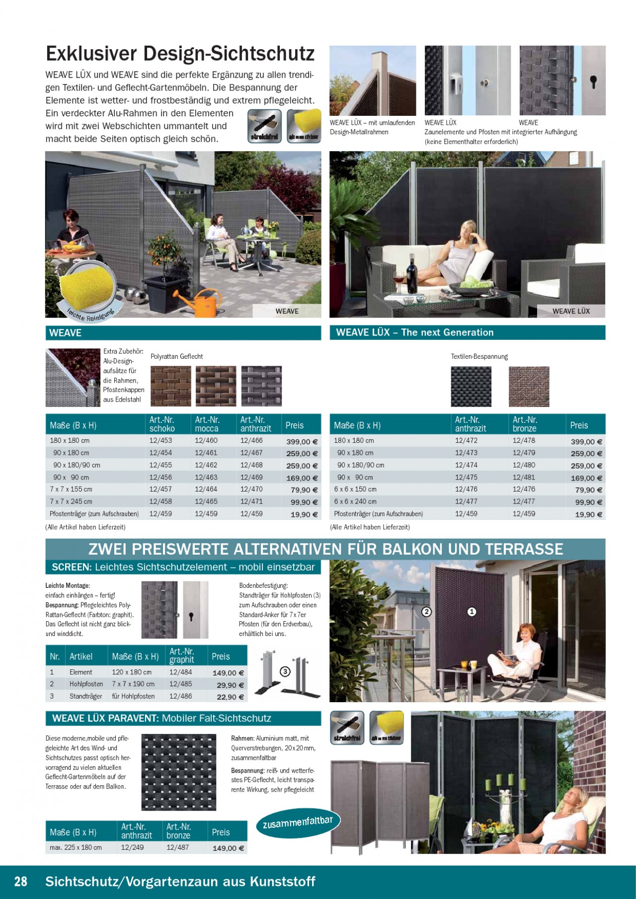 INHALT: Exklusiver Design-Sichtschutz WEAVE LÜX und WEAVE sind die perfekte Ergänzung zu allen trendigen Textilen- und Geflecht-Gartenmöbeln. Die Bespannung der Elemente ist wetter- und frostbeständig und extrem pflegeleicht. Ein verdeckter Alu-Rahmen in den Elementen wird mit zwei Webschichten ummantelt und macht beide Seiten optisch gleich schön. WEAVE LÜX mit umlaufenden Design-Metallrahmen WEAVE LÜX WEAVE Zaunelemente und Pfosten mit integrierter Aufhängung (keine Elementhalter erforderlich) le ic h te Reinig u ng WEAVE WEAVE LÜX WEAVE Extra Zubehör: Polyrattan Geflecht Alu-Designaufsätze für die Rahmen, Pfostenkappen aus Edelstahl WEAVE LÜX The next Generation Textilen-Bespannung Maße (B x H) 180 x 180 cm 90 x 180 cm 90 x 180/90 cm 90 x 90 cm 7 x 7 x 155 cm 7 x 7 x 245 cm Pfostenträger (zum Aufschrauben) (Alle Artikel haben Lieferzeit) Art.-Nr. schoko 12/453 12/454 12/455 12/456 12/457 12/458 12/459 Art.-Nr. mocca 12/460 12/461 12/462 12/463 12/464 12/465 12/459 Art.-Nr. anthrazit 12/466 12/467 12/468 12/469 12/470 12/471 12/459 Preis 399,00 259,00 259,00 169,00 79,90 99,90 19,90 Maße (B x H) 180 x 180 cm 90 x 180 cm 90 x 180/90 cm 90 x 90 cm 6 x 6 x 150 cm 6 x 6 x 240 cm Pfostenträger (zum Aufschrauben) (Alle Artikel haben Lieferzeit) Art.-Nr. anthrazit 12/472 12/473 12/474 12/475 12/476 12/477 12/459 Art.-Nr. bronze 12/478 12/479 12/480 12/481 12/476 12/477 12/459 Preis 399,00 259,00 259,00 169,00 79,90 99,90 19,90 ZWEI PREISWERTE ALTERNATIVEN FÜR BALKON UND TERRASSE SCREEN: Leichtes Sichtschutzelement mobil einsetzbar Leichte Montage: einfach einhängen fertig! Bespannung: Pflegeleichtes PolyRattan-Geflecht (Farbton: graphit). Das Geflecht ist nicht ganz blickund winddicht. Bodenbefestigung: Standträger für Hohlpfosten (3) zum Aufschrauben oder einen Standard-Anker für 7 x 7er Pfosten (für den Erdverbau), erhältlich bei uns. 2 1 Nr. 1 2 3 Artikel Element Hohlpfosten Standträger Maße (B x H) 120 x 180 cm 7 x 7 x 190 cm für Hohlpfosten Art.-Nr. graphit 12/484 12/485 12/486 Preis 149,00 29,90 22,90 3 WEAVE LÜX PARAVENT: Mobiler Falt-Sichtschutz Diese moderne,mobile und pflegeleichte Art des Wind- und Sichtschutzes passt optisch hervorragend zu vielen aktuellen Geflecht-Gartenmöbeln auf der Terrasse oder auf dem Balkon. Rahmen: Aluminium matt, mit Querverstrebungen, 20 x 20 mm, zusammenfaltbar Bespannung: reiß- und wetterfestes PE-Geflecht, leicht transparente Wirkung, sehr pflegeleicht Maße (B x H) max. 225 x 180 cm Art.-Nr. anthrazit 12/249 Art.-Nr. bronze 12/487 Preis 149,00 zusammenfaltbar 28 Sichtschutz/Vorgartenzaun aus Kunststoff