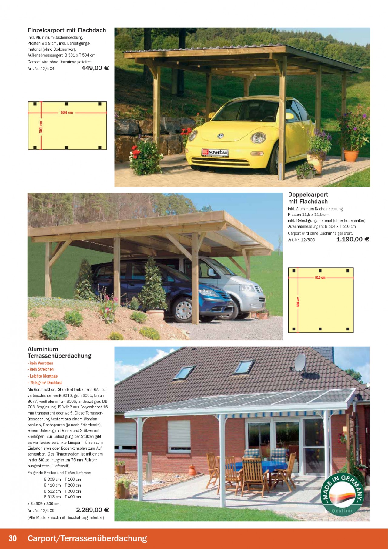 INHALT: Einzelcarport mit Flachdach inkl. Aluminium-Dacheindeckung, Pfosten 9 x 9 cm, inkl. Befestigungsmaterial (ohne Bodenanker), Außenabmessungen: B 301 x T 504 cm Carport wird ohne Dachrinne geliefert. Art.-Nr. 12/504 449,00 Doppelcarport mit Flachdach inkl. Aluminium-Dacheindeckung, Pfosten 11,5 x 11,5 cm, inkl. Befestigungsmaterial (ohne Bodenanker), Außenabmessungen: B 604 x T 510 cm Carport wird ohne Dachrinne geliefert. Art.-Nr. 12/505 1.190,00 Aluminium Terrassenüberdachung - kein Verrotten - kein Streichen - Leichte Montage - 75 kg/m2 Dachlast Alu-Konstruktion: Standard-Farbe nach RAL pulverbeschichtet weiß 9016, grün 6005, braun 8077, weiß-aluminium 9006, anthrazit-grau DB 703, Verglasung: ISO-HKP aus Polycarbonat 16 mm transparent oder weiß. Diese Terrassenüberdachung besteht aus einem Wandanschluss, Dachsparren (je nach Erfordernis), einem Unterzug mit Rinne und Stützen mit Zierbögen. Zur Befestigung der Stützen gibt es wahlweise verzinkte Einspannhülsen zum Einbetonieren oder Bodenkonsolen zum Aufschrauben. Das Rinnensystem ist mit einem in der Stütze integrierten 75 mm Fallrohr ausgestattet. (Lieferzeit) Folgende Breiten und Tiefen lieferbar: B 309 cm T 100 cm B 410 cm T 200 cm B 512 cm T 300 cm B 613 cm T 400 cm z.B.: 309 x 300 cm, Art.-Nr. 12/506 2.289,00 (Alle Modelle auch mit Beschattung lieferbar) 30 Carport/Terrassenüberdachung