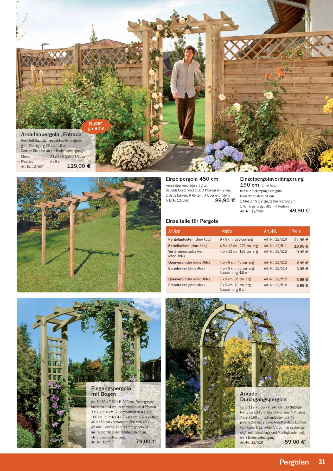 INHALT: Pfosten 9 x 9 cm Arkadenpergola ,,Entrada" Komplett-Bausatz, kesseldruckimprägniert grün, Durchgang 60 bis 116 cm Denken Sie bitte an die Bodenbefestigung! Maße: B 180 x H 218 x T 85 cm Pfosten: 9 x 9 cm 129,00 Art.-Nr. 12/507 Einzelpergola 450 cm kesseldruckimprägniert grün, Bausatz bestehend aus: 3 Pfosten 9 x 9 cm, 2 Sattelbalken, 9 Reitern, 4 Querverbindern Art.-Nr. 12/508 89,90 Einzelpergolaverlängerung 190 cm (ohne Abb.) kesseldruckimprägniert grün, Bausatz bestehend aus: 1 Pfosten 9 x 9 cm, 2 Querverbindern, 1 Verlängerungsbalken, 4 Reitern Art.-Nr. 12/509 49,90 Einzelteile für Pergola Artikel Pergolapfosten (ohne Abb.) Sattelbalken (ohne Abb.) Verlängerungsbalken (ohne Abb.) Querverbinder (ohne Abb.) Einzelreiter (ohne Abb.) Querverbinder (ohne Abb.) Einzelreiter (ohne Abb.) Maße 9 x 9 cm, 290 cm lang 4,5 x 12 cm, 225 cm lang 4,5 x 12 cm, 189 cm lang 4,5 x 9 cm, 45 cm lang 4,5 x 9 cm, 60 cm lang, Aussparrung 4,5 cm 7 x 9 cm, 36 cm lang 7 x 9 cm, 70 cm lang, Aussparrung 9 cm Art.-Nr. Art.-Nr. 12/510 Art.-Nr. 12/511 Art.-Nr. 12/512 Art.-Nr. 12/513 Art.-Nr. 12/514 Art.-Nr. 12/515 Art.-Nr. 12/516 Preis 21,95 10,95 9,95 2,95 3,95 3,95 5,95 Eingangspergola mit Bogen ca. B 160 x T 62 x H 220 cm, Durchgangsbreite ca 114 cm, bestehend aus: 4 Pfosten 7 x 7 x 210 cm, 2 Leimholzbögen 4 x 7 x 160 cm, 5 Reiter 4 x 7 x 62 cm, 2 Rankgitter 40 x 160 cm vermontiert (Rahmen 45 x 45 mm, Leisten 12 x 30 mm gehobelt) inkl. Beschläge und Montageanleitung, ohne Bodenbefestigung, Art.-Nr. 12/517 79,00 ArkadeDurchgangspergola ca. B 119 x T 58 x H 240 cm, Durchgangsbreite ca 103 cm, bestehend aus: 4 Pfosten 7 x 7 x 180 cm, 2 Rundbögen 3 x 7 cm jeweils 2-teilig, 2 Lamellengitter 40 x 150 cm vormontiert, Lamellen 5 x 60 mm sauber gesägt, inkl. Beschläge und Montageanleitung, ohne Bodenbefestigung, Art.-Nr. 12/518 59,00 Pergolen 31