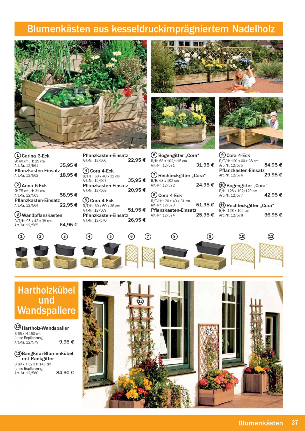 INHALT: Blumenkästen aus kesseldruckimprägniertem Nadelholz 1 Carina 6-Eck 35,95 Pflanzkasten-Einsatz Art.-Nr. 12/562 18,95 2 Anna 6-Eck Ø: 75 cm, H: 31 cm Art.-Nr. 12/563 Ø: 60 cm, H: 29 cm Art.-Nr. 12/561 Pflanzkasten-Einsatz Art.-Nr. 12/566 22,95 4 Cora 4-Eck B/T/H: 60 x 40 x 31 cm Art.-Nr. 12/567 6 Bogengitter ,,Cora" B/H: 68 x 102/115 cm Art.-Nr. 12/571 9 Cora 4-Eck 31,95 58,95 Pflanzkasten-Einsatz Art.-Nr. 12/564 22,95 3 Wandpflanzkasten B/T/H: 95 x 43 x 38 cm Art.-Nr. 12/565 35,95 Pflanzkasten-Einsatz Art.-Nr. 12/568 20,95 5 Cora 4-Eck B/T/H: 60 x 60 x 38 cm Art.-Nr. 12/569 7 Rechteckgitter ,,Cora" B/H: 68 x 102 cm Art.-Nr. 12/572 84,95 Pflanzkasten-Einsatz Art.-Nr. 12/576 29,95 10 Bogengitter ,,Cora" B/H: 128 x 102/120 cm Art.-Nr. 12/577 B/T/H: 120 x 60 x 38 cm Art.-Nr. 12/575 24,95 8 Cora 4-Eck 42,95 64,95 3 51,95 Pflanzkasten-Einsatz Art.-Nr. 12/570 26,95 4 5 6 7 51,95 Pflanzkasten-Einsatz Art.-Nr. 12/574 25,95 B/T/H: 120 x 40 x 31 cm Art.-Nr. 12/573 11 Rechteckgitter ,,Cora" B/H: 128 x 102 cm Art.-Nr. 12/578 36,95 1 2 8 9 10 11 Hartholzkübel und Wandspaliere 12 Hartholz-Wandspalier B 65 x H 150 cm (ohne Bepflanzung) Art.-Nr. 12/579 12 13 9,95 13 Bangkirai-Blumenkübel mit Rankgitter B 80 x T 32 x H 145 cm (ohne Bepflanzung) Art.-Nr. 12/580 84,90 Blumenkästen 37
