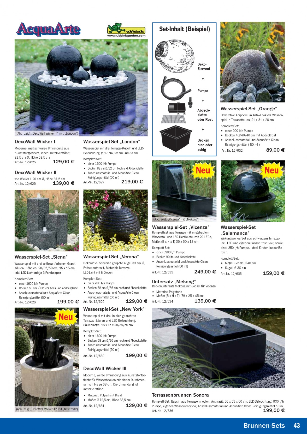 INHALT: Set-Inhalt (Beispiel) DekoElement + Pumpe + Abdeckplatte oder Rost Wasserspiel-Set ,,Orange" Dekorative Amphore im Antik-Look als Wasserspiel in Terracotta, ca. 21 x 31 x 26 cm Komplett-Set: · einer 900 l/h Pumpe · Becken 40/40/40 cm mit Abdeckrost · Anschlussmaterial und AcquaArte Clean Reinigungsmittel ( 50 ml ) Art.-Nr. 12/632 + (Abb. zeigt ,,DecoWall Wicker II" mit ,,London") DecoWall Wicker I Moderne, mattschwarze Umrandung aus Kunststoffgeflecht, innen metallverstärkt, 72,5 cm Ø, Höhe 38,5 cm Art.-Nr. 12/625 129,00 Wasserspiel-Set ,,London" Wasserspiel mit drei Terrazzo-Kugeln und LEDBeleuchtung, Ø 17 cm, 25 cm und 33 cm Komplett-Set: · einer 1600 l/h Pumpe · Becken 88 cm Ø/32 cm hoch und Abdeckplatte · Anschlussmaterial und AcquaArte Clean Reinigungsmittel (50 ml) Art.-Nr. 12/627 219,00 Becken rund oder eckig 89,00 DecoWall Wicker II wie Wicker I, 90 cm Ø, Höhe 37,5 cm Art.-Nr. 12/626 139,00 Neu Neu (Abb. zeigt ,,Vicenza" mit ,,Mekong") Wasserspiel-Set ,,Vicenza" Komplettset aus Terrazzo mit eingebautem Wasserfall und LED-Lichtleiste, mit 20 LEDs, Maße: (B x H x T) 35 x 50 x 13 cm Komplett-Set: · einer 3900 l/h Pumpe · Becken 90 ltr. und Abdeckplatte · Anschlussmaterial und AcquaArte Clean Reinigungsmittel (50 ml) Art.-Nr. 12/633 Wasserspiel-Set ,,Salamanca" Wirkungsvolles Set aus schwarzem Terrazzo inkl. LED und eigenem Wasserreservoir, sowie einer 350 l/h Pumpe. Ideal für den Indoor-Bereich. Komplett-Set: · Maße: Schale Ø 40 cm · Kugel: Ø 30 cm Art.-Nr. 12/635 Wasserspiel-Set ,,Siena" Wasserspiel mit drei anthrazitfarbenen Granitsäulen, Höhe ca. 20/35/50 cm, 15 x 15 cm, inkl. LED-Licht mit je 3 Farbkappen Komplett-Set: · einer 1600 l/h Pumpe · Becken 68 cm Ø/36 cm hoch und Abdeckplatte · Anschlussmaterial und AcquaArte Clean Reinigungsmittel (50 ml) Art.-Nr. 12/628 199,00 Wasserspiel-Set ,,Verona" Dekorative, teilweise gerippte Kugel 33 cm Ø, Farbe: anthrazit, Material: Terrazzo, LED-Licht mit 8 Dioden Komplett-Set: · einer 900 l/h Pumpe · Becken 68 cm Ø/36 cm hoch und Abdeckplatte · Anschlussmaterial und AcquaArte Clean Reinigungsmittel (50 ml) Art.-Nr. 12/629 129,00 249,00 159,00 Untersatz ,,Mekong" Beckenuntersatz Mekong mit Sockel für Vicenza · Material: Polystone · Maße: (B x H x T): 79 x 25 x 45 cm Art.-Nr. 12/634 139,00 Wasserspiel-Set ,,New York" Neu Wasserspiel mit drei in sich gedrehten Terrazzo Säulen und LED Beleuchtung, Säulenmaße: 15 x 15 x 20/35/50 cm Komplett-Set: · einer 1600 l/h Pumpe · Becken 68 cm Ø/36 cm hoch und Abdeckplatte · Anschlussmaterial und AcquaArte Clean Reinigungsmittel (50 ml) Art.-Nr. 12/630 199,00 DecoWall Wicker III Moderne, weiße Umrandung aus Kunststoffgeflecht für Wasserbecken mit einem Durchmesser von bis zu 68 cm. Die Umrandung ist metallverstärkt. · Material: Polyrattan/ Draht · Maße: Ø 72,5 cm, Höhe 38,5 cm Art.-Nr. 12/631 (Abb. zeigt ,,DecoWall Wicker III" mit ,,New York") Terrassenbrunnen Sonora Komplett-Set, Bassin aus Terrazzo in edlem Anthrazit, 50 x 33 x 50 cm, LED-Beleuchtung, 900 l/h Pumpe, eigenes Wasserreservoir, Anschlussmaterial und AcquaArte Clean Reinigungsmittel 50 ml Art.-Nr. 12/636 199,00 129,00 Brunnen-Sets 43