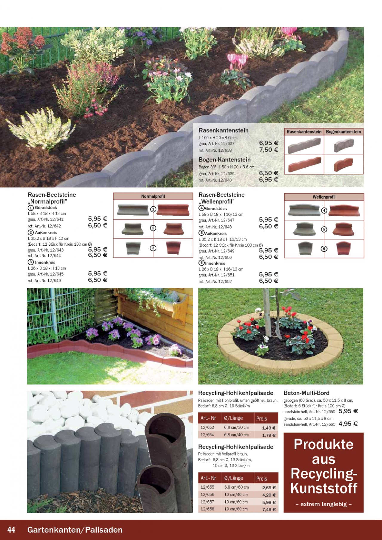 INHALT: Rasenkantenstein L 100 x H 20 x B 6 cm, grau, Art.-Nr. 12/637 rot, Art.-Nr. 12/638 Rasenkantenstein Bogenkantenstein 6,95 7,50 6,50 6,95 Wellenprofil 4 Bogen-Kantenstein Bogen 30°, L 50 x H 20 x B 6 cm, grau, Art.-Nr. 12/639 rot, Art.-Nr. 12/640 Rasen-Beetsteine ,,Normalprofil" 1 Geradstück L 58 x B 18 x H 13 cm grau, Art.-Nr. 12/641 5,95 rot, Art.-Nr. 12/642 6,50 2 Außenkreis L 35,2 x B 18 x H 13 cm (Bedarf: 12 Stück für Kreis 100 cm Ø) grau, Art.-Nr. 12/643 5,95 rot, Art.-Nr. 12/644 6,50 3 Innenkreis L 26 x B 18 x H 13 cm grau, Art.-Nr. 12/645 5,95 rot, Art.-Nr. 12/646 6,50 Normalprofil 1 Rasen-Beetsteine ,,Wellenprofil" 4 Geradstück L 58 x B 18 x H 16/13 cm grau, Art.-Nr. 12/647 5,95 rot, Art.-Nr. 12/648 6,50 5 Außenkreis L 35,2 x B 18 x H 16/13 cm (Bedarf: 12 Stück für Kreis 100 cm Ø) grau, Art.-Nr. 12/649 5,95 rot, Art.-Nr. 12/650 6,50 6 Innenkreis L 26 x B 18 x H 16/13 cm grau, Art.-Nr. 12/651 5,95 rot, Art.-Nr. 12/652 6,50 2 5 3 6 Recycling-Hohlkehlpalisade Palisaden mit Hohlprofil, unten geöffnet, braun, Bedarf: 6,8 cm Ø, 19 Stück/m Beton-Multi-Bord gebogen (60 Grad), ca. 50 x 11,5 x 8 cm, (Bedarf: 6 Stück für Kreis 100 cm Ø) sandstein-hell, Art.-Nr. 12/659 5,95 gerade, ca. 50 x 11,5 x 8 cm sandstein-hell, Art.-Nr. 12/660 4,95 Art.- Nr 12/653 12/654 Ø/Länge 6,8 cm/30 cm 6,8 cm/40 cm Preis 1,49 1,79 Recycling-Hohlkehlpalisade Palisaden mit Vollprofil braun, Bedarf: 6,8 cm Ø, 19 Stück/m, 10 cm Ø, 13 Stück/m Art.- Nr 12/655 12/656 12/657 12/658 Ø/Länge 6,8 cm/60 cm 10 cm/40 cm 10 cm/60 cm 10 cm/80 cm Preis 2,69 4,29 5,99 7,49 Produkte aus RecyclingKunststoff extrem langlebig 44 Gartenkanten/Palisaden