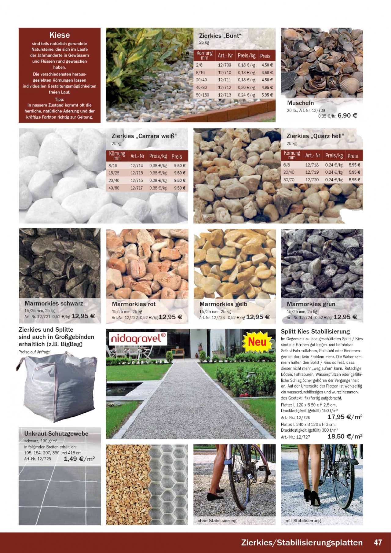 INHALT: Kiese sind teils natürlich gerundete Natursteine, die sich im Laufe der Jahrhunderte in Gewässern und Flüssen rund gewaschen haben. Die verschiedensten herausgesiebten Körnungen lassen individuellen Gestaltungsmöglichkeiten freien Lauf. Tipp: in nassem Zustand kommt oft die herrliche, natürliche Aderung und der kräftige Farbton richtig zur Geltung. Zierkies ,,Bunt" 25 kg Körnung Art.- Nr Preis/kg Preis mm 2/8 8/16 20/40 40/80 50/150 12/709 12/710 12/711 12/712 12/713 0,18 /kg 0,18 /kg 0,18 /kg 0,20 /kg 0,24 /kg 4,50 4,50 4,50 4,95 5,95 Muscheln 20 ltr., Art.-Nr. 12/739 0,35 /ltr. 6,90 Zierkies ,,Carrara weiß" 25 kg Zierkies ,,Quarz hell" 25 kg Körnung Art.- Nr Preis/kg Preis mm 8/16 15/25 20/40 40/60 12/714 12/715 12/716 12/717 0,38 /kg 0,38 /kg 0,38 /kg 0,38 /kg 9,50 9,50 9,50 9,50 Körnung Art.- Nr Preis/kg Preis mm 6/8 20/40 30/70 12/718 12/719 12/720 0,24 /kg 0,24 /kg 0,24 /kg 5,95 5,95 5,95 Marmorkies schwarz 15/25 mm, 25 kg Art.-Nr. 12/721 0,52 /kg 12,95 Marmorkies rot 15/25 mm, 25 kg Art.-Nr. 12/722 0,52 /kg 12,95 Marmorkies gelb 15/25 mm, 25 kg Art.-Nr. 12/723 0,52 /kg 12,95 Marmorkies grün 15/25 mm, 25 kg Art.-Nr. 12/724 0,52 /kg 12,95 Zierkies und Splitte sind auch in Großgebinden erhältlich (z.B. BigBag) Preise auf Anfrage Splitt-Kies Stabilisierung Neu Unkraut-Schutzgewebe schwarz, 100 g/m2, in folgenden Breiten erhältlich: 105, 154, 207, 330 und 415 cm Art.-Nr. 12/725 1,49 /m2 Im Gegensatz zu lose geschütteten Splitt / Kies sind die Flächen gut begeh- und befahrbar. Selbst Fahrradfahren, Rollstuhl oder Kinderwagen ist dort kein Problem mehr. Die Wabenkammern halten den Splitt / Kies so fest, dass dieser nicht mehr ,,weglaufen" kann. Rutschige Böden, Fahrspuren, Wasserpfützen oder gefährliche Schlaglöcher gehören der Vergangenheit an. Auf der Unterseite der Platten ist werkseitig ein wasserdurchlässiges und wurzelhemmendes Geotextil fix+fertig aufgebracht. Platte: L 120 x B 80 x H 2,5 cm, Druckfestigkeit (gefüllt) 150 t/m2 Art.- Nr.: 12/726 17,95 /m2 Platte: L 240 x B 120 x H 3 cm, Druckfestigkeit (gefüllt) 300 t/m2 Art.- Nr.: 12/727 18,50 /m2 ohne Stabilisierung mit Stabilisierung Zierkies/Stabilisierungsplatten 47