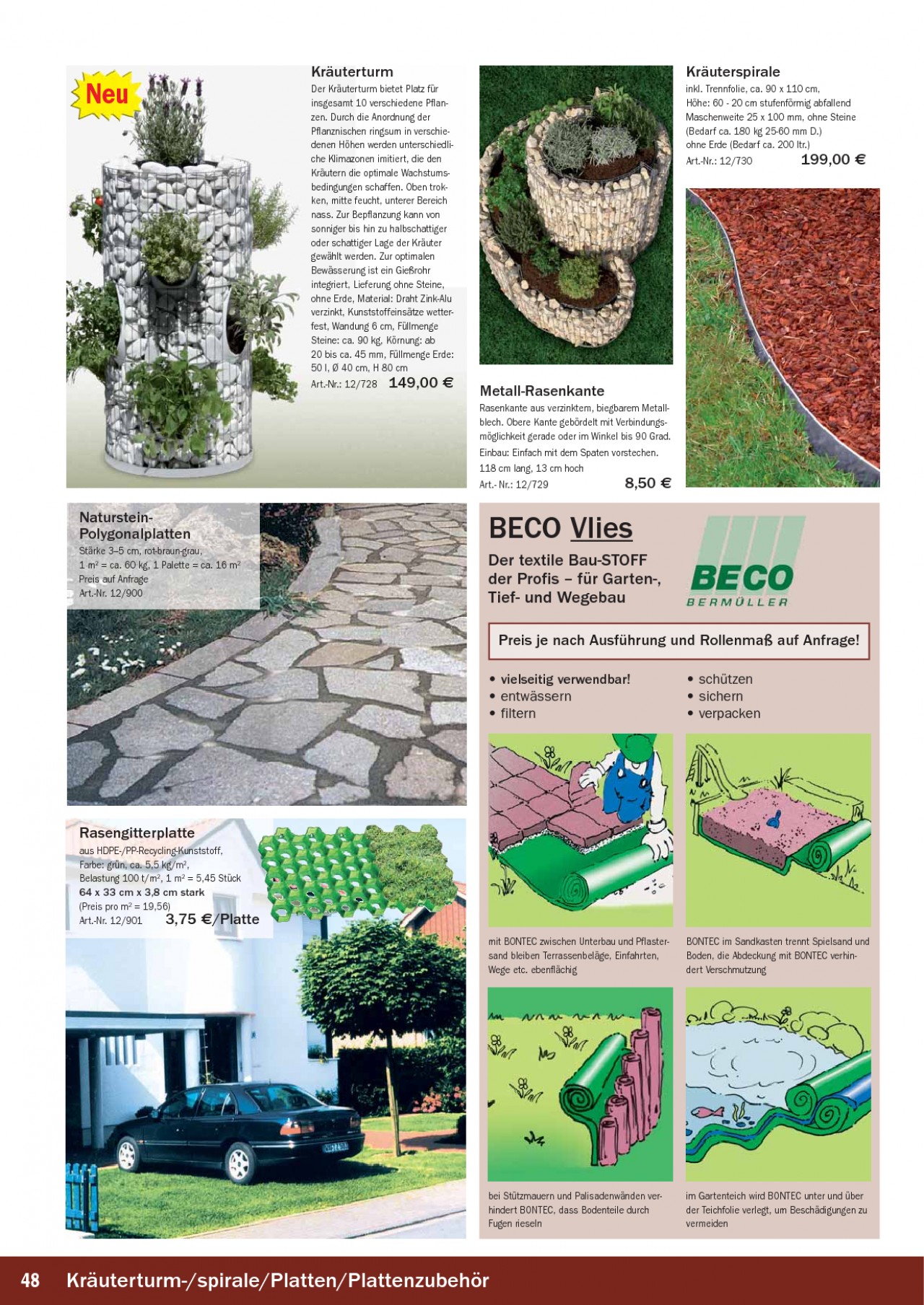 INHALT: Kräuterturm Kräuterspirale inkl. Trennfolie, ca. 90 x 110 cm, Höhe: 60 - 20 cm stufenförmig abfallend Maschenweite 25 x 100 mm, ohne Steine (Bedarf ca. 180 kg 25-60 mm D.) ohne Erde (Bedarf ca. 200 ltr.) Art.-Nr.: 12/730 199,00 Neu Der Kräuterturm bietet Platz für insgesamt 10 verschiedene Pflanzen. Durch die Anordnung der Pflanznischen ringsum in verschiedenen Höhen werden unterschiedliche Klimazonen imitiert, die den Kräutern die optimale Wachstumsbedingungen schaffen. Oben trokken, mitte feucht, unterer Bereich nass. Zur Bepflanzung kann von sonniger bis hin zu halbschattiger oder schattiger Lage der Kräuter gewählt werden. Zur optimalen Bewässerung ist ein Gießrohr integriert, Lieferung ohne Steine, ohne Erde, Material: Draht Zink-Alu verzinkt, Kunststoffeinsätze wetterfest, Wandung 6 cm, Füllmenge Steine: ca. 90 kg, Körnung: ab 20 bis ca. 45 mm, Füllmenge Erde: 50 l, Ø 40 cm, H 80 cm Art.-Nr.: 12/728 149,00 Metall-Rasenkante Rasenkante aus verzinktem, biegbarem Metallblech. Obere Kante gebördelt mit Verbindungsmöglichkeit gerade oder im Winkel bis 90 Grad. Einbau: Einfach mit dem Spaten vorstechen. 118 cm lang, 13 cm hoch 8,50 Art.- Nr.: 12/729 NatursteinPolygonalplatten Stärke 35 cm, rot-braun-grau, 1 m2 = ca. 60 kg, 1 Palette = ca. 16 m2 Preis auf Anfrage Art.-Nr. 12/900 BECO Vlies Der textile Bau-STOFF der Profis für Garten-, Tief- und Wegebau Preis je nach Ausführung und Rollenmaß auf Anfrage! · vielseitig verwendbar! · entwässern · filtern · schützen · sichern · verpacken Rasengitterplatte aus HDPE-/PP-Recycling-Kunststoff, Farbe: grün, ca. 5,5 kg/m2, Belastung 100 t/m2, 1 m2 = 5,45 Stück 64 x 33 cm x 3,8 cm stark (Preis pro m2 = 19,56) Art.-Nr. 12/901 3,75 /Platte mit BONTEC zwischen Unterbau und Pflastersand bleiben Terrassenbeläge, Einfahrten, Wege etc. ebenflächig BONTEC im Sandkasten trennt Spielsand und Boden, die Abdeckung mit BONTEC verhindert Verschmutzung bei Stützmauern und Palisadenwänden verhindert BONTEC, dass Bodenteile durch Fugen rieseln im Gartenteich wird BONTEC unter und über der Teichfolie verlegt, um Beschädigungen zu vermeiden 48 Kräuterturm-/spirale/Platten/Plattenzubehör