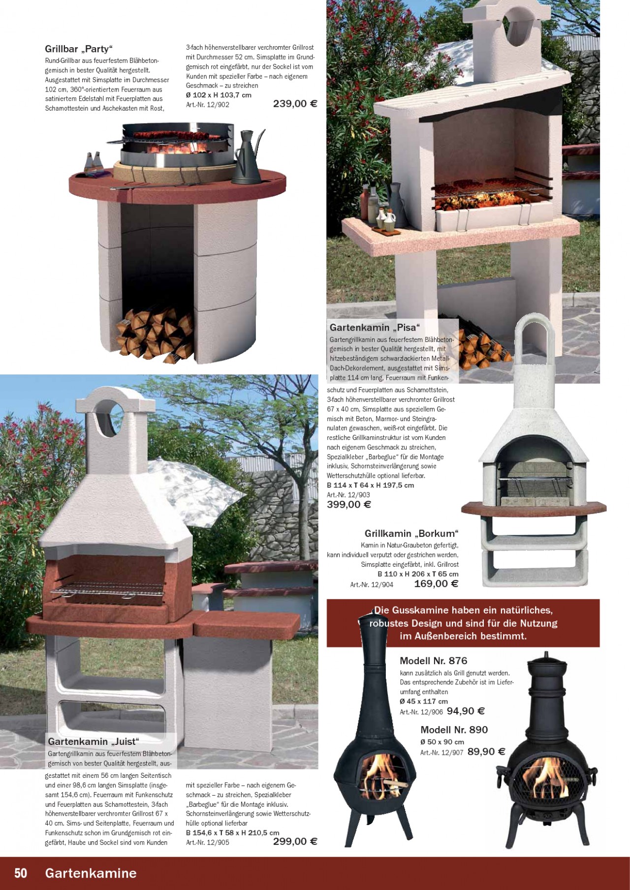 INHALT: Grillbar ,,Party" Rund-Grillbar aus feuerfestem Blähbetongemisch in bester Qualität hergestellt. Ausgestattet mit Simsplatte im Durchmesser 102 cm, 360°-orientiertem Feuerraum aus satiniertem Edelstahl mit Feuerplatten aus Schamottestein und Aschekasten mit Rost, 3-fach höhenverstellbarer verchromter Grillrost mit Durchmesser 52 cm. Simsplatte im Grundgemisch rot eingefärbt, nur der Sockel ist vom Kunden mit spezieller Farbe nach eigenem Geschmack zu streichen Ø 102 x H 103,7 cm Art.-Nr. 12/902 239,00 Gartenkamin ,,Pisa" Gartengrillkamin aus feuerfestem Blähbetongemisch in bester Qualität her gestellt, mit hitzebeständigem schwarzlackierten MetallDach-Dekorelement, ausgestattet mit Simsplatte 114 cm lang, Feuerraum mit Funkenschutz und Feuerplatten aus Schamottstein, 3-fach höhenverstellbarer verchromter Grillrost 67 x 40 cm, Simsplatte aus speziellem Gemisch mit Beton, Marmor- und Steingranulaten gewaschen, weiß-rot eingefärbt. Die restliche Grillkaminstruktur ist vom Kunden nach eigenem Geschmack zu streichen, Spezialkleber ,,Barbeglue" für die Montage inklusiv, Schornsteinverlängerung sowie Wetterschutzhülle optional lieferbar. B 114 x T 64 x H 197,5 cm Art.-Nr. 12/903 399,00 Grillkamin ,,Borkum" Kamin in Natur-Graubeton gefertigt, kann individuell verputzt oder gestrichen werden, Simsplatte eingefärbt, inkl. Grillrost B 110 x H 206 x T 65 cm Art.-Nr. 12/904 169,00 Die Gusskamine haben ein natürliches, robustes Design und sind für die Nutzung im Außenbereich bestimmt. Modell Nr. 876 kann zusätzlich als Grill genutzt werden. Das entsprechende Zubehör ist im Lieferumfang enthalten Ø 45 x 117 cm Art.-Nr. 12/906 94,90 Modell Nr. 890 Gartenkamin ,,Juist" Gartengrillkamin aus feuerfestem Blähbetongemisch von bester Qualität hergestellt, ausgestattet mit einem 56 cm langen Seitentisch und einer 98,6 cm langen Simsplatte (insgesamt 154,6 cm). Feuerraum mit Funkenschutz und Feuerplatten aus Schamottestein, 3-fach höhenverstellbarer verchromter Grillrost 67 x 40 cm. Sims- und Seitenplatte, Feuerraum und Funkenschutz schon im Grundgemisch rot eingefärbt, Haube und Sockel sind vom Kunden mit spezieller Farbe nach eigenem Geschmack zu streichen, Spezialkleber ,,Barbeglue" für die Montage inklusiv. Schornsteinverlängerung sowie Wetterschutzhülle optional lieferbar B 154,6 x T 58 x H 210,5 cm Art.-Nr. 12/905 299,00 Ø 50 x 90 cm Art.-Nr. 12/907 89,90 50 Gartenkamine